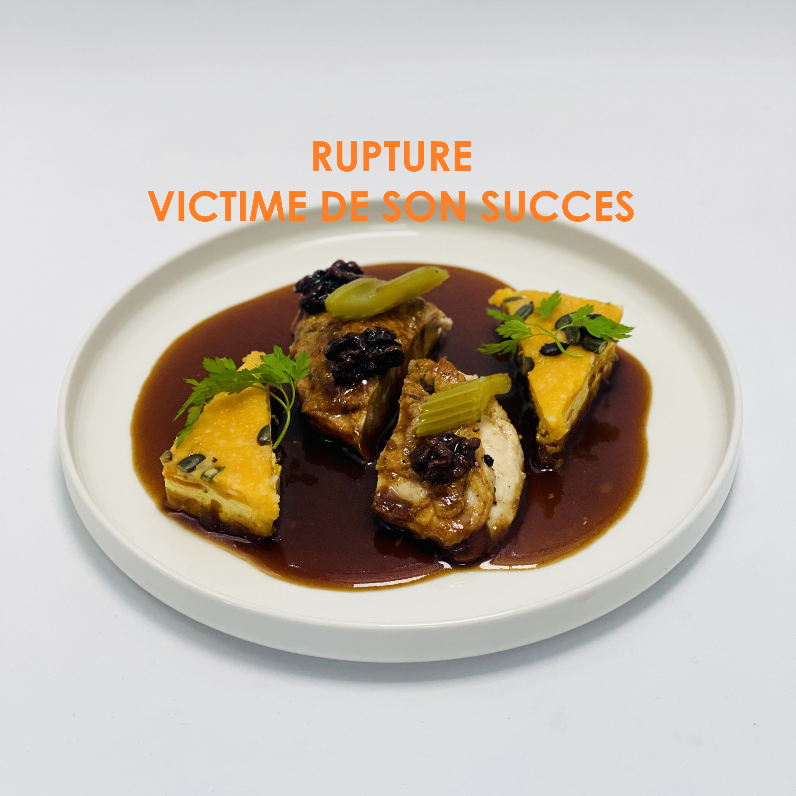 Suprême de pintade mariné 35.6% (pintade origine France 28.8%, sirop de noix de macadamia 6.7%, vinaigre balsamique (SULFITE), amidon modifié de maïs, gélatine de boeuf, poivre noir de penja), jus macadamia 29.1% (aile de poulet, fond de veau (CELERI), fond de volaille (CELERI), oignon, sirop de noix macadamia 0.7%, vinaigre balsamique (SULFITE), carotte, farine de BLE, fond de sauce, CELERI, huile de colza, amidon modifié de maïs, ail, poivre noir fumé, thym), gratin de butternut 29.1% (butternut 12.5%, potimarron 5%, CREME, oignon, OEUFentier, comté, graine de courge, BEURRE, gélatine de boeuf, huile d’olive, amidon modifié de maïs, sel, muscade), CELERIbranche 3.2% (huile d’olive, sel), noix confite 2.9% (noix, eau, sucre, sel)