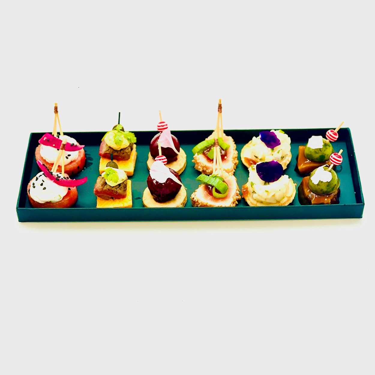 filet de canette 18,02%(origine FR); saumon 14,28%(salmo salar POISSON – origine : norvège); boeuf 6,95%(origine Fr); patates douces 5,22%; chèvre frais5,06%(LAIT); pasteque 4,99%; SESAME 4,72%; Bloc de foie gras de canard 69,5% 4,71%(foie gras de canard, eau, sel, Porto SULFITE, poivre, antioxydant L-ascorbate de sodium), CREME, oignon rouge, huile d’olive, citron confit , mélange 5 baies, thym, cumin.; saint-jacques 4,58%(Zygochlamys patagonica MOLLUSQUES); sauce SOJA 4,28%(eau, graines de SOJA, blé GLUTEN, sel); ananas 3,29%; blinis 3,16%(eau, farine de blé GLUTEN, huile de tournesol, lactose LAIT, protéines de LAIT, LAIT écrémé en poudre – Iactosérum LAIT en poudre, OEUFS entiers et blancs d’OEUFS déshydratés, poudres à lever: E500ii et E450i, sel, antioxydant acide ascorbique); crème 2,14%(LAIT – origine FR) ; farine 1,86%(GLUTEN); huile de colza 1,77%; jus de citron 1,35%; griottes 1,22%; beurre 1,22%(LAIT ); OEUFS 1,14%(origine FR); échalotes 1,12%; citron confit 0,71%; cerfeuil frais 0,63%; crème 0,62%(LAIT); ail 0,55%; sucre 0,48%; oignon rouge local 0,47%; ail 0,47%; gélatine 0,36%; coriandre fraiche 0,33%; vinaigre de vin rouge 0,33%(Vinaigre de vin rouge 6° SULFITES); ciboulette 0,27%; beurre de cacao 0,2%; thym frais 0,19%; laurier 0,19%; huile de SESAME toasté 0,17%; sucre glace 0,16%; noisette FRUITS A COQUE 0,16%; ŒUF 0,16%; curcuma 0,13%; cumin 0,13%; coriandre 0,13%; curry 0,13%(dont MOUTARDE); sel 0,13%; paprika 0,13%; fleur de pensée 0,06%; pectine 0,05%; SESAME noir 0,05%; amidon de maïs 0,04%; piment de Cayenne 0,02%; piment doux 0,01%; origan 0,01%; MOUTARDE 0,01%; thym 0,01%; poivre 0,01%; vinaigre de framboise 0,01%(vinaigre de vin rouge, arôme naturelle de framboise, conservateur : SULFITE acide de potassium); Gélifiant natural algues rouges 0,01%; huile essentielle bio de gingembre
