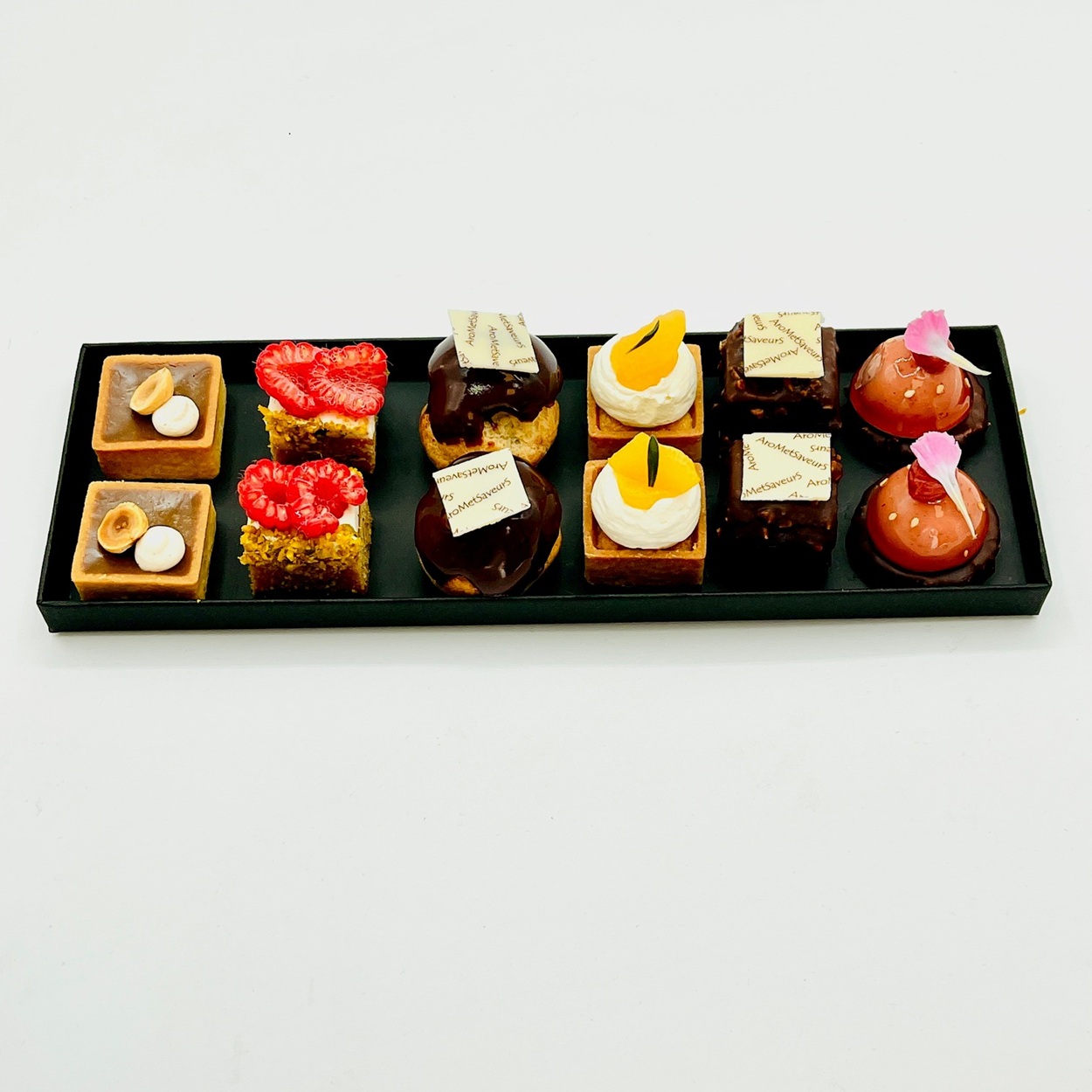 | MINI FINANCIER AUX NOISETTES, FRAMBOISES ET CITRON VERT MINI CHOUX CHOCOLAT MINI ROCHER CARAMEL TENDRE NOIX DE PECAN MINI CARRE ABRICOT ROMARIN MINI TARTELETTE CHOCOLAT AMANDE NOISETTE MINI DOME FRAISES BASILIC BISCUIT CHOCOLAT |